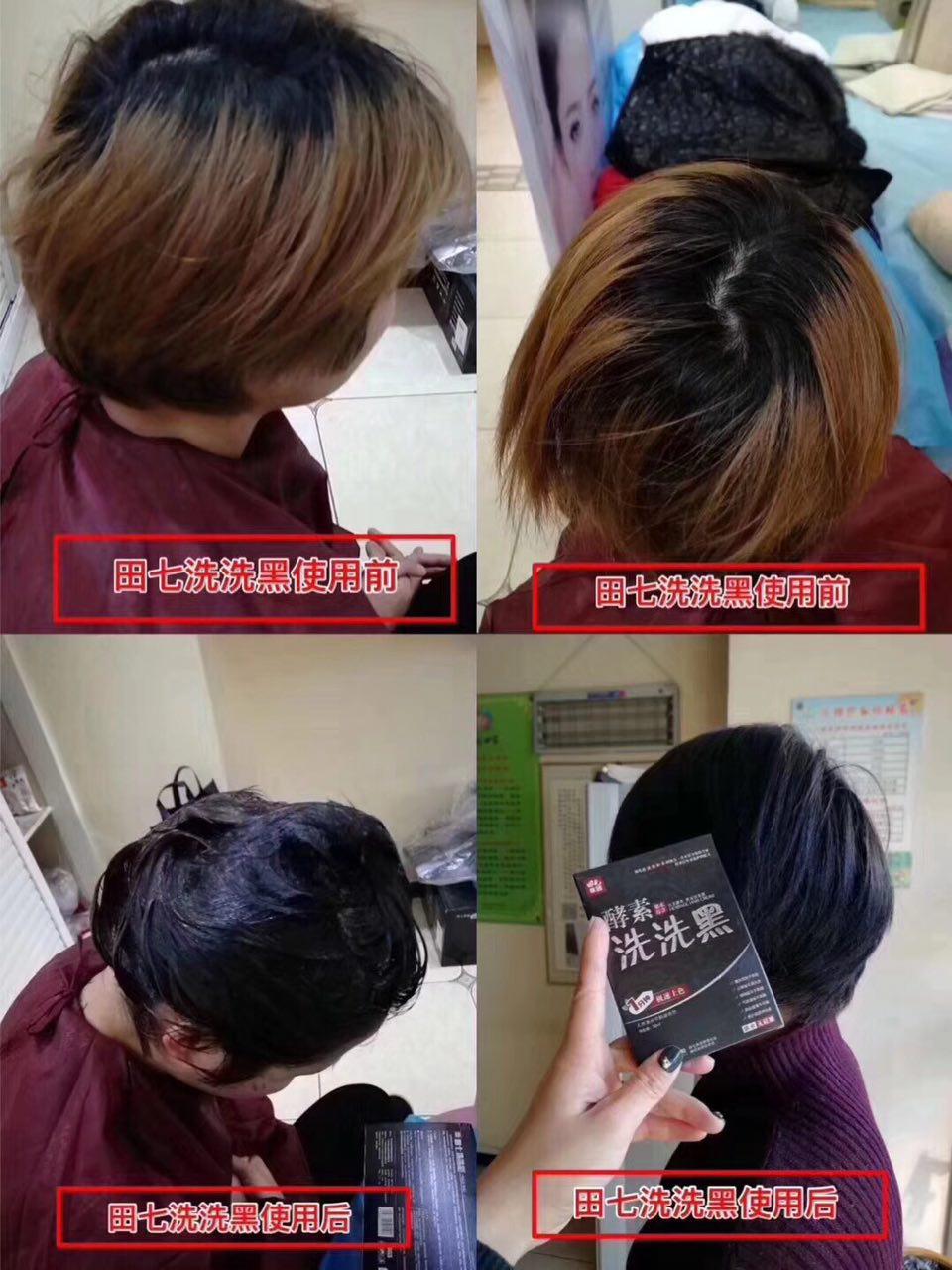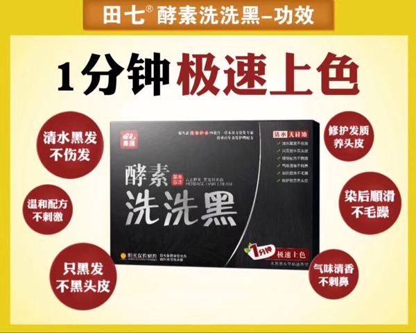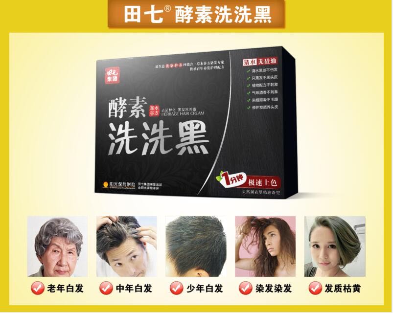 【田七酵素洗洗黑】是由具有70多年历史的田七集团精心打造的一款产品。其中含有中含有五倍子、黑芝麻、黑桑葚、黑豆、何首乌、黑糯米等提取物,柔顺秀发,养护头皮,快速使白发变黑发的神奇产品,让你在头发上色同时拥有健康头皮。 是由阳光保险公司承保,产品安全有效,所以大家放心使用。 使用方法:这款洗洗黑就是跟平实在家使用的洗发水差不多,直接干发涂抹洗发水于头发上均匀按摩几分钟,让头发充分接触产品,十几分钟后冲洗干净吹干即可,只黑头发不黑头皮,简单容易上手,在家即可操作的。 温馨提示:一盒里面有五小盒可使用五次,承诺一次见效。