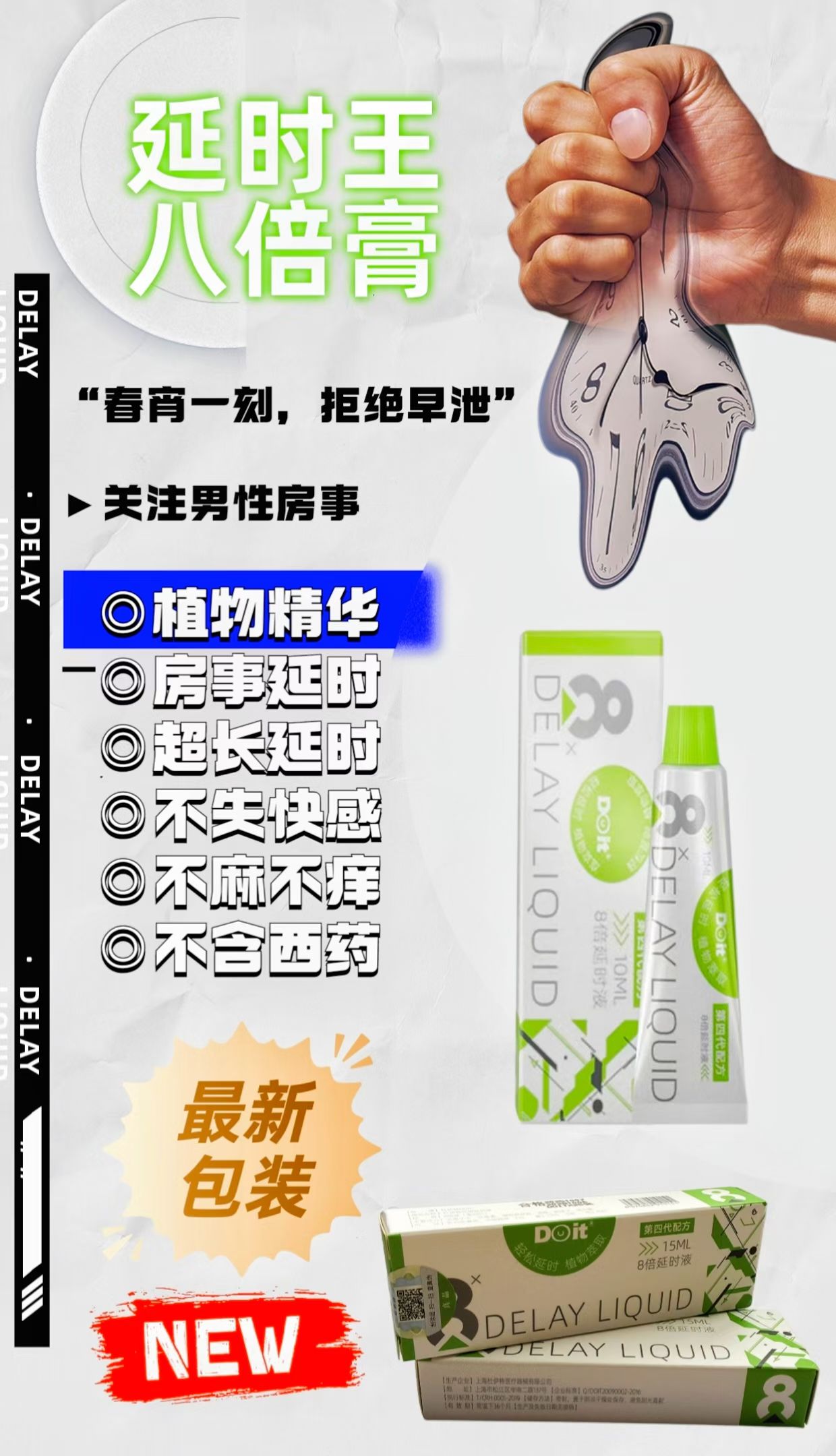 根据人体对时间长短的吸收不同,分别设置了 358 倍不同的比案,它是普通延时产品的 358 倍的吸收效力,根据了每个人的情况不同,设置了三个等级,358 倍指在吸收配比方面全新升级,总有一款适合您。