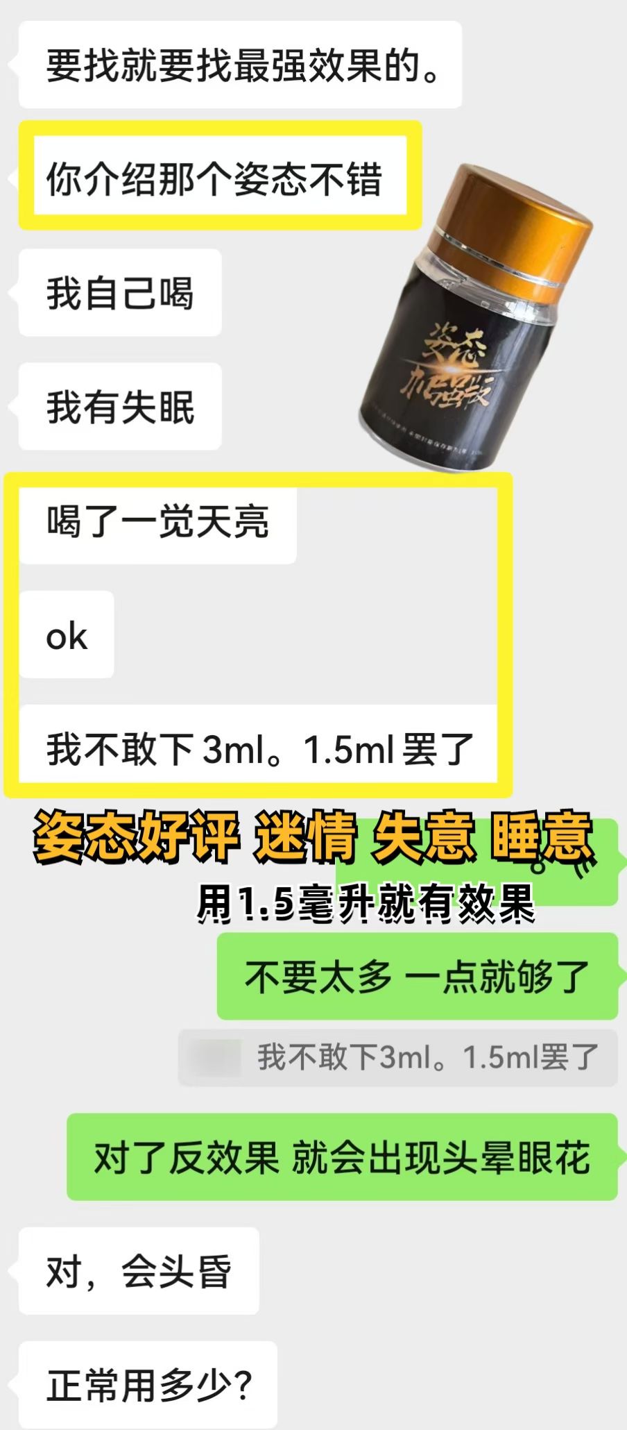姿态本品具有催眠催情效果,進口迷魂水,本品為水劑,下在酒水里無色,與飲料酒水配伍,真可謂珠聯璧合,麻醉催情效果更佳,藥力見效快,真是走幾步便面色緋紅,全身燥熱,眼神迷離,渾身癱軟四肢無力,任人擺布。有此藥偷情野合,可謂看上的女孩一個不落。此藥有助劫陰頻繁、竭其精而后快。請低調使用此藥。