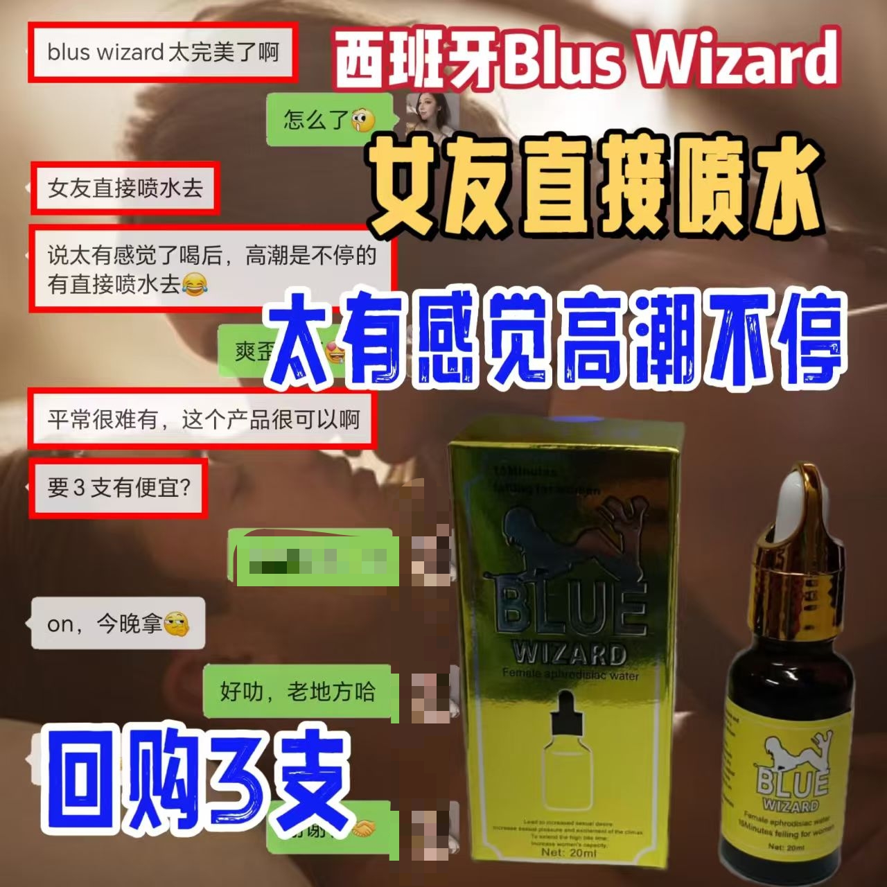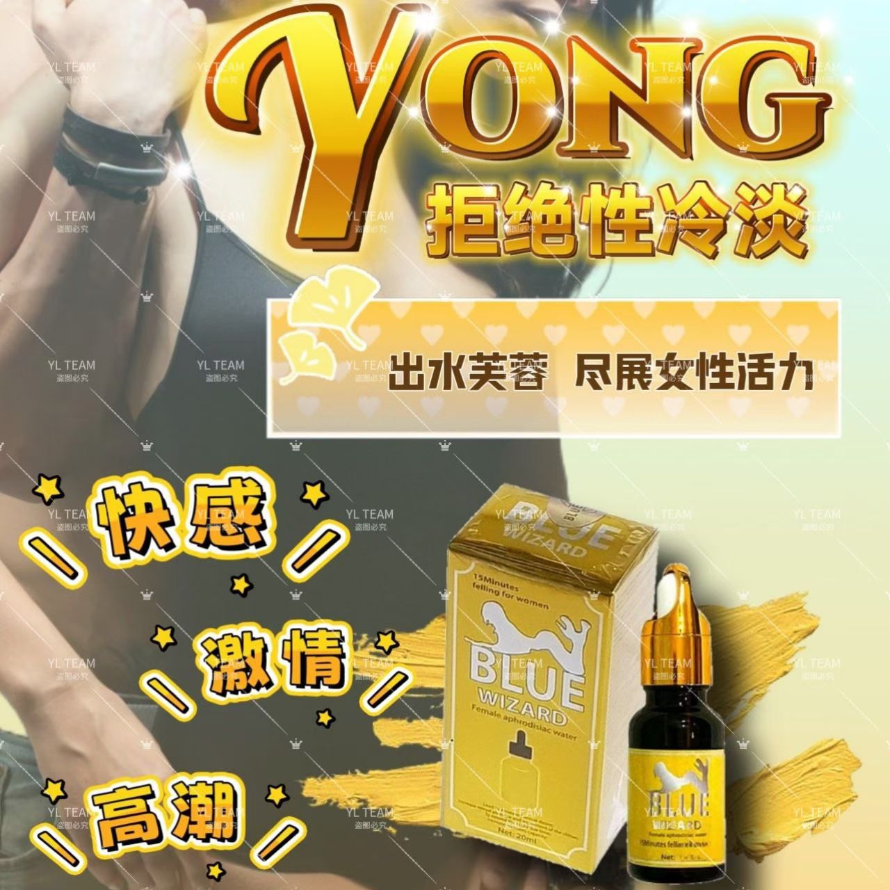 本品为透明液体,能迅速溶于水,在各种饮品中不被发现。女性饮用后几分钟内会迅速出现面色微红、呼吸急促、头皮发热、浑身干热等症状,此时女性性欲旺盛,阴道(瘙痒、大腿麻木)迫切需要性生活而无法抑制。主要成分: