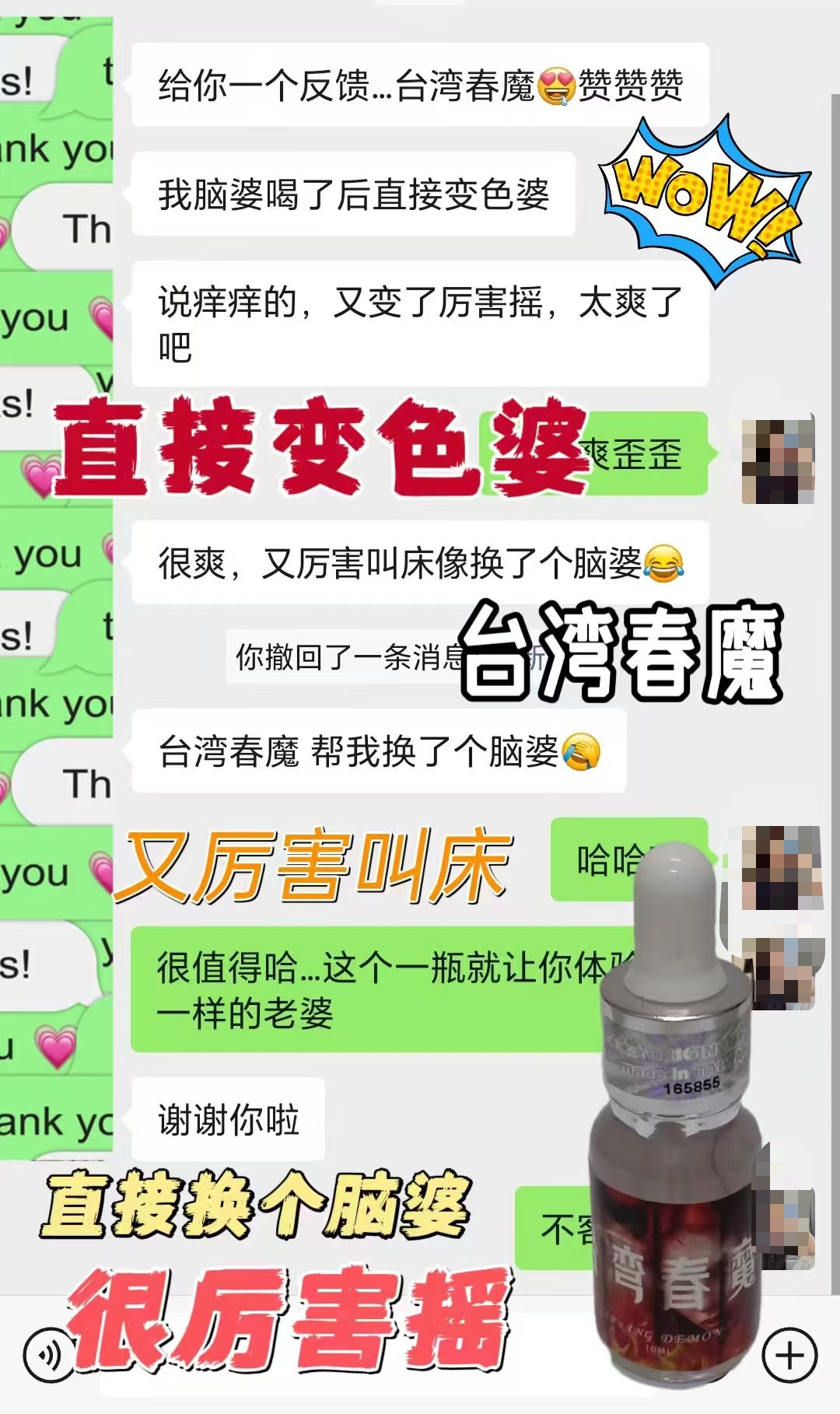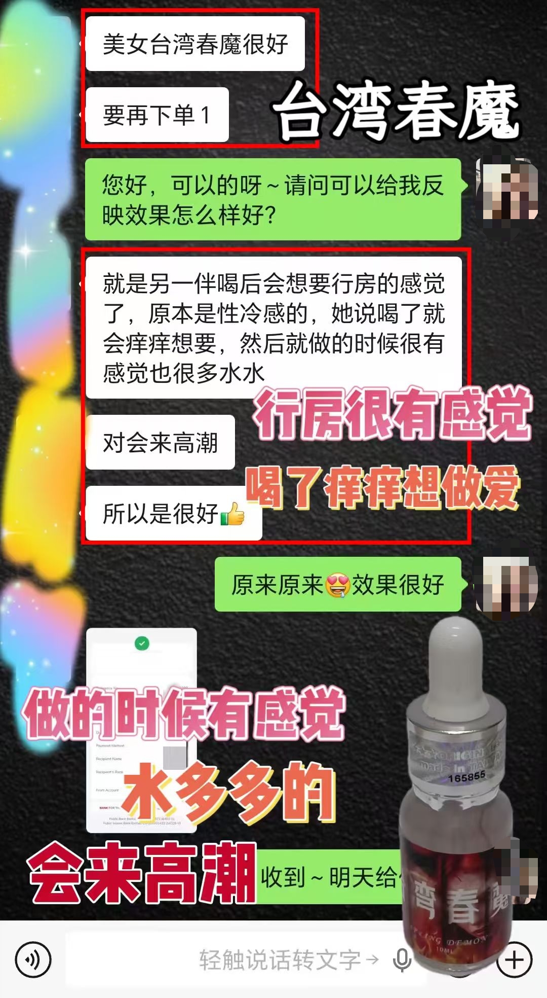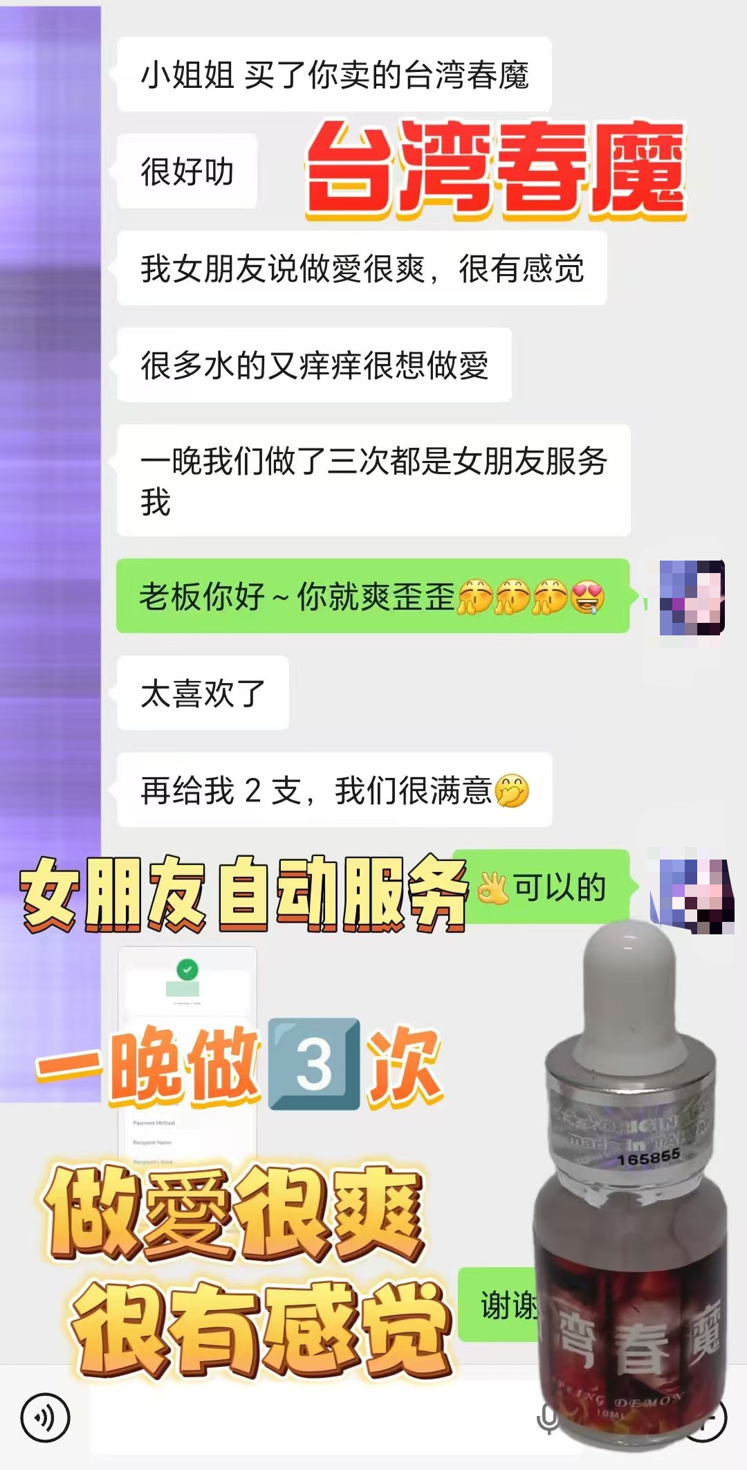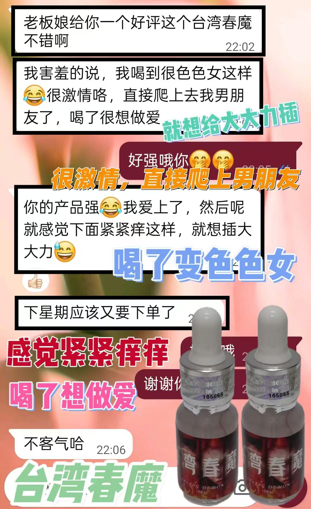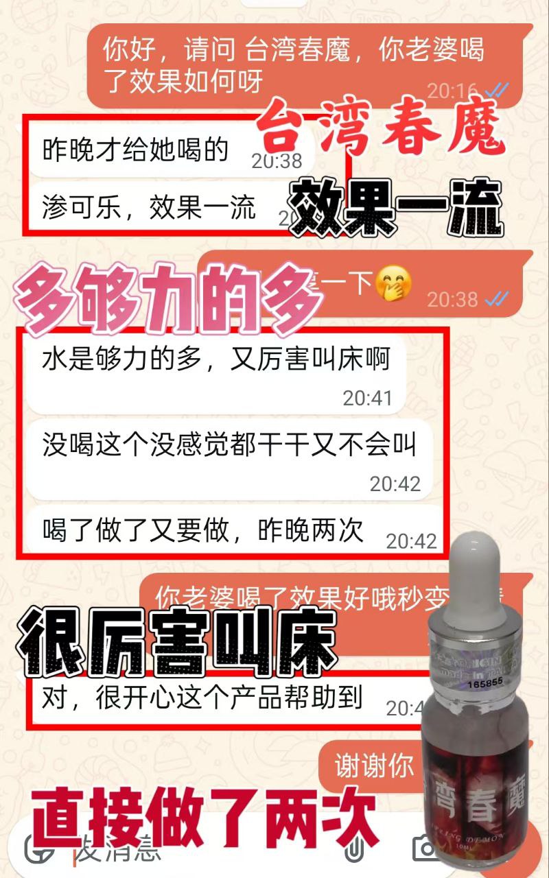 新品[庆祝][庆祝]台湾春魔,就有一种强烈的性.爱欲望,浑身舒痒,性.欲亢进,阴.液大量外流,急需异性陪伴,大腿和小腹处舒痒无比,身体异常敏感 ~很想和你啪啪啪 😘 ★功效 : 增进性爱情趣,对女性性冷淡有极好的改善作用。 ★用法与用量:房事前5分钟,取本品溶于开水,咖啡、啤酒或其他饮料中服用