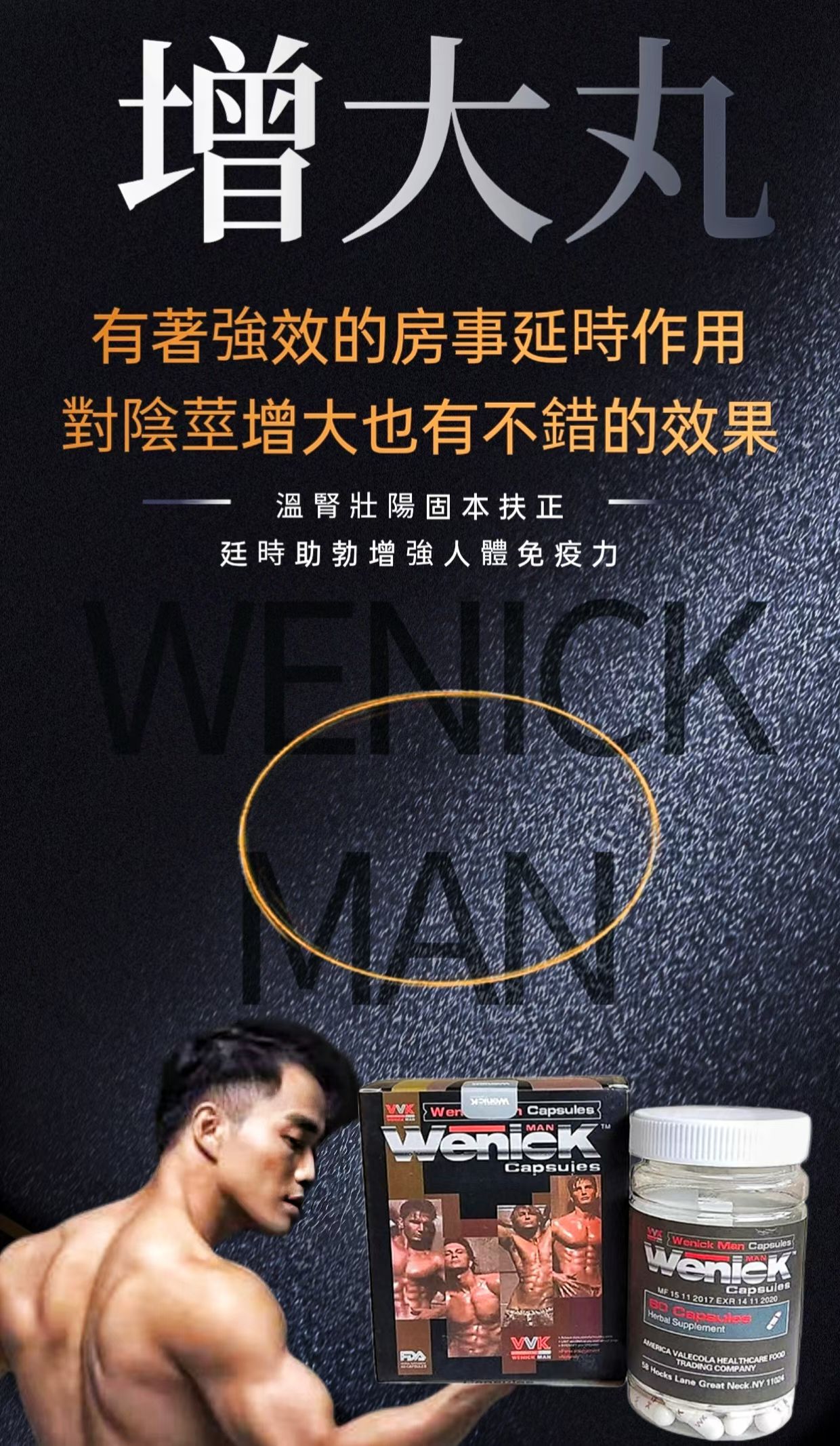 WENICK MAN胶囊使用的草药配方,提供3451增长必需的所有营养成分,除了能够增强3451的长度和围度外,还可以全面的提高3451的健康。